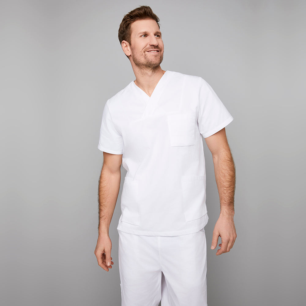 Weißer Schlupfkasack mit hochgeschnittenem V-Ausschnitt für unkompliziertes An- und Ausziehen ohne Verschlusselemente. Das funktionale Design bietet eine Brusttasche und zwei aufgesetzte Seitentaschen für praktischen Stauraum. Seitenschlitze gewährleisten optimale Bewegungsfreiheit im professionellen Einsatz. Erhältlich in zwei bewährten Materialvarianten: Variante 29975 mit ausgewogener 50/50-Mischung aus Baumwolle und Polyester für klassischen Tragekomfort, sowie Variante 29920 mit erhöhtem Polyesteranteil (65 %) für verbesserte Pflegeleichtigkeit und Formstabilität. Beide Qualitäten gewährleisten Langlebigkeit und Zuverlässigkeit im täglichen Arbeitseinsatz. Die zeitlose weiße Färbung erfüllt höchste hygienische Standards und bietet maximale Kombinierbarkeit.