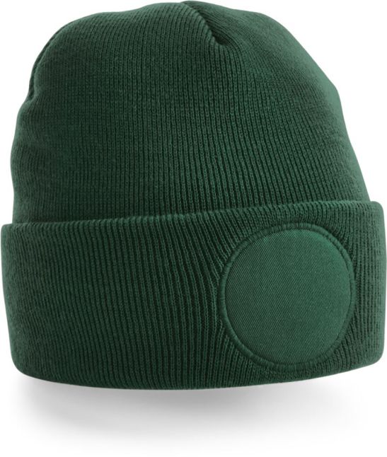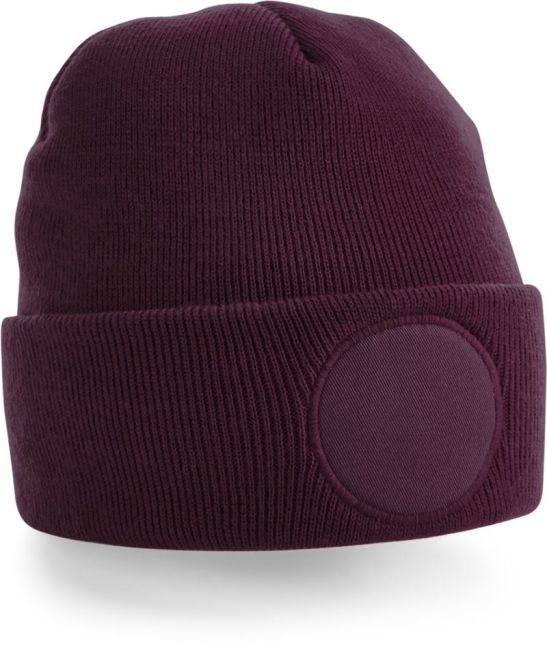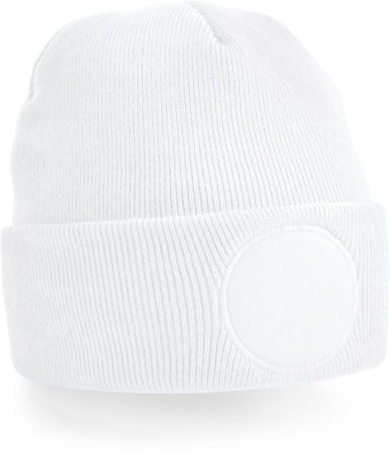 Circular Patch Beanie mit Umschlag. Doppelt gestrickt, weicher Griff. Der kreisrunde Patch aus Baumwoll-Twill (Durchmesser 6 cm) ist ideal für eine Veredelung.