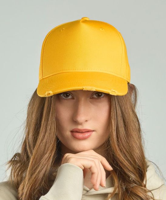 Panel Kappe Vintage-Look, Used-Look mit abgewetztem Schirm und Kanten, Schweißband vorne um 4 Reihen verstärkt, strukturiertes Frontsegment, Stoffband mit Metallverschluss, TearAway Label, Handwäsche, nicht bügeln, nicht trocknergeeignet, nicht chemisch reinigen Größen: onesize 290g/m², 100% Chino Baumwoll-Twill