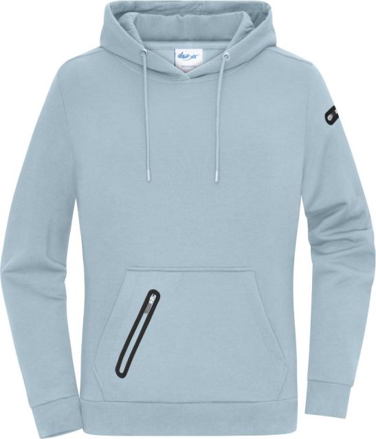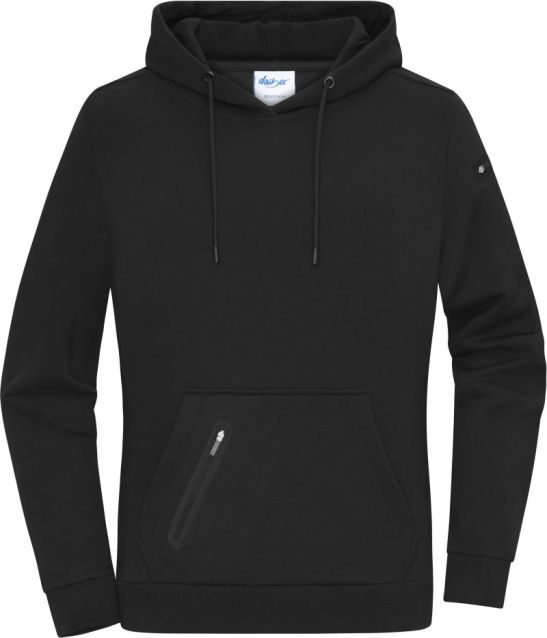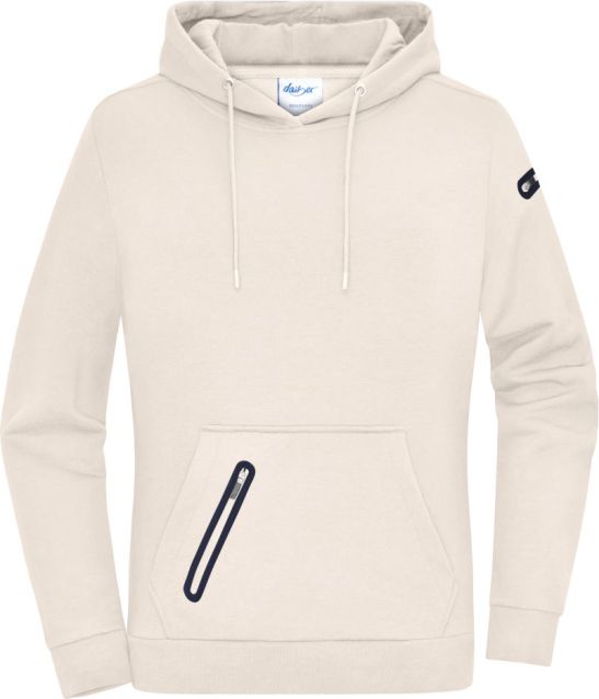 Leicht taillierter Schnitt, gefütterte Kapuze mit Kordel, Kängurutasche mit zusätzlicher Reißverschlusstasche, Reißverschlusstasche am linken Ärmel, 30° waschbar, Schonwäsche, nicht trocknergeeignet