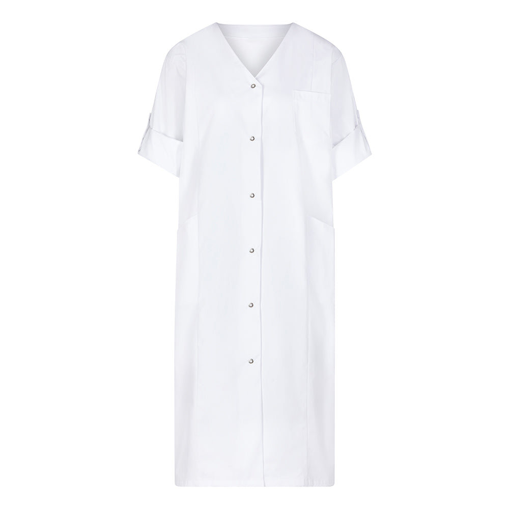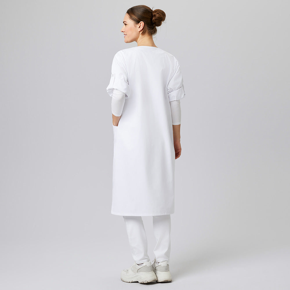 Dieser Damen-Laborkittel vereint funktionales Design mit modernem Stil für anspruchsvolle Arbeitsumgebungen. Die Langärmel lassen sich dank praktischer Lasche und Knopf schnell und sicher hochkrempeln – ideal für flexible Arbeitssituationen. Der elegante V-Ausschnitt schafft ein offenes, feminines Erscheinungsbild. Mit einer Rückenlänge von etwa 101 cm (Größe M) bietet der Kittel optimalen Sitz und ausreichend Bewegungsspielraum. Die Druckknopfleiste ermöglicht müheloses An- und Ausziehen auch unter Zeitdruck. Die Materialkombination aus 65 % Polyester und 35 % Baumwolle (170 g/m²) garantiert Leichtigkeit, Strapazierfähigkeit und Pflegeleichtigkeit. OEKO-TEX® Standard 100 Zertifizierung bestätigt die Schadstofffreiheit und Hautverträglichkeit des Materials. Für höchste Hygienestandards ist der Kittel industriewäsche-, autoklavierbar und sterilisierbar – perfekt für Labore und medizinische Einrichtungen. Eine Brusttasche (ca. 9,5 x 12 cm) bietet Platz für Stifte und kleine Arbeitsmittel.