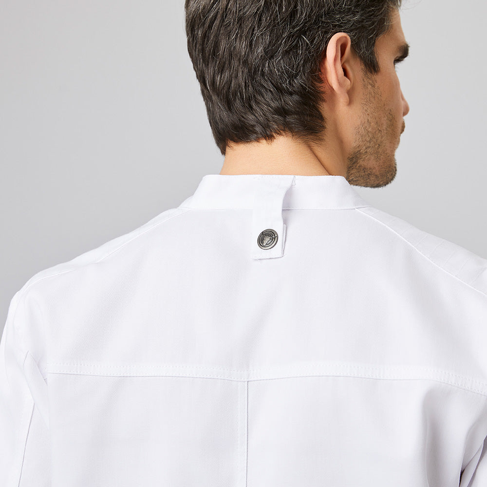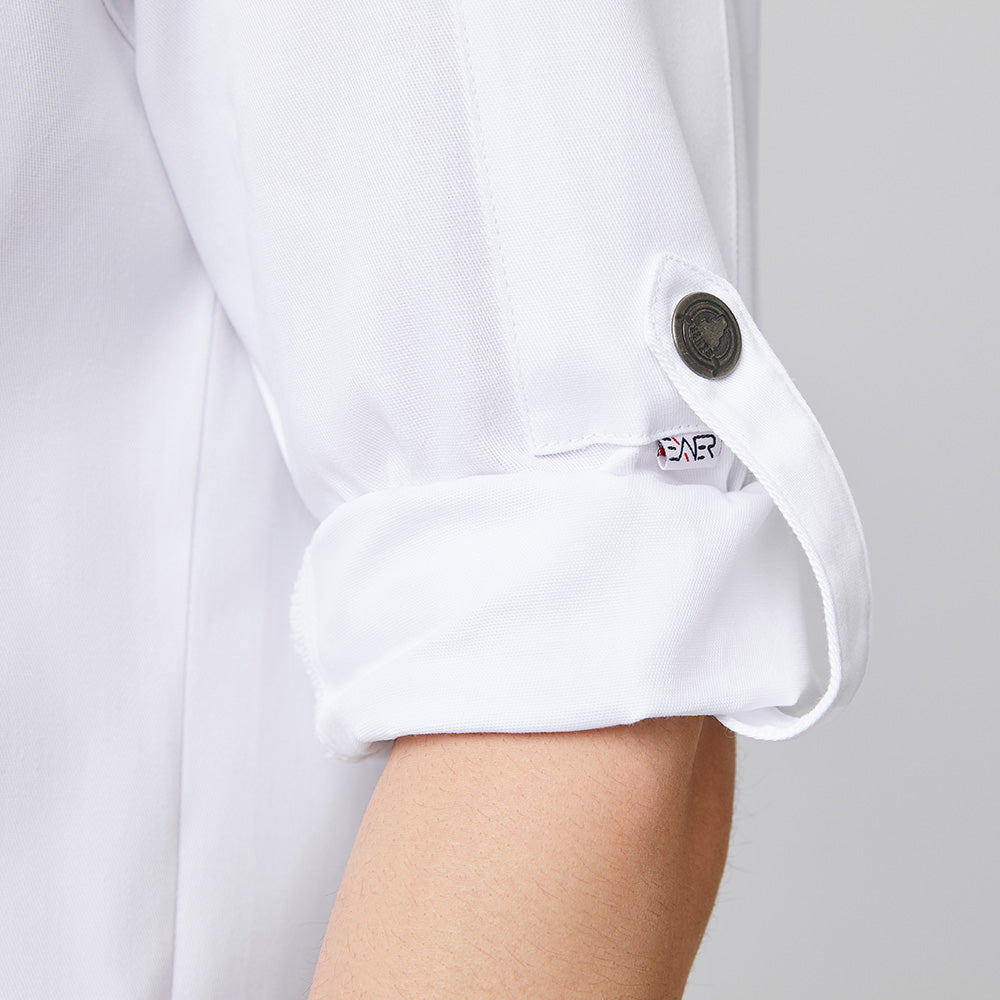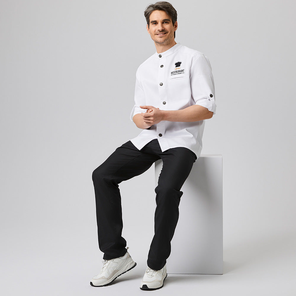 Die Kochjacke Bikerstyle Art. Nr. 2252 vereint Funktionalität mit modernem Design für den professionellen Küchenalltag. Mit langen Ärmeln bietet sie zuverlässigen Schutz, während die praktische Trapezform maximale Bewegungsfreiheit garantiert. Die einfach zu bedienende 1-reihige Druckknopfleiste ermöglicht schnelles An- und Ausziehen. Der klassische Stehkragen wirkt zeitlos elegant, und die hochbindbaren Ärmel lassen sich individuell anpassen. Zwei durchdachte Taschen – eine verdeckte Brustleistentasche und eine Armtasche für Stifte oder Thermometer – bieten praktischen Stauraum. Das Unisex-Modell ist in verschiedenen Materialzusammensetzungen erhältlich: Die Royal Blue Variante mit Stretch-Anteil (78% Baumwolle, 22% Elasthan) bietet maximale Flexibilität, während die anderen Farben (Schwarz, Weiß, Graphit) aus robustem Polyester-Baumwoll-Mix bestehen und besonders pflegeleicht sind.
