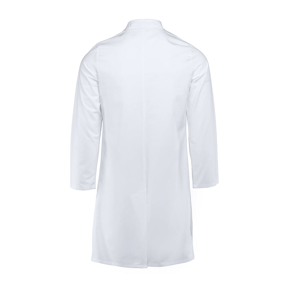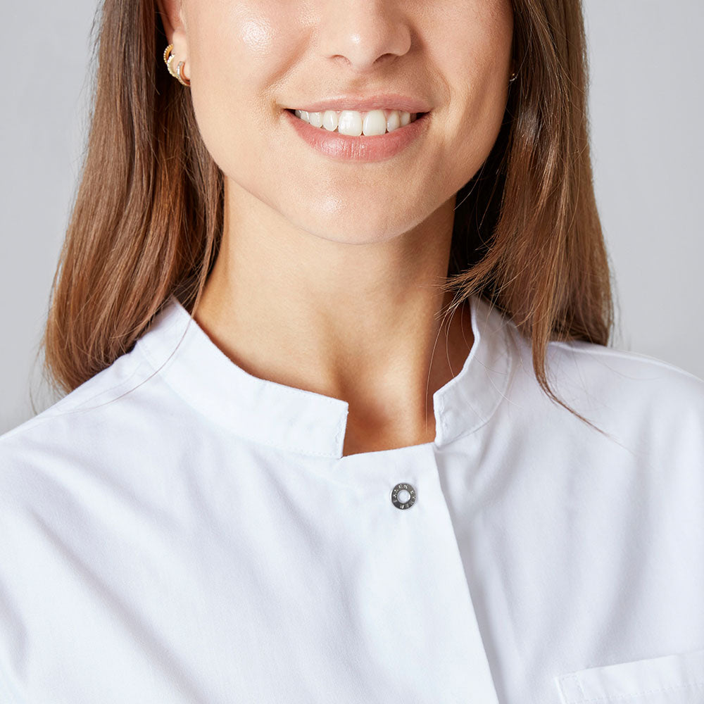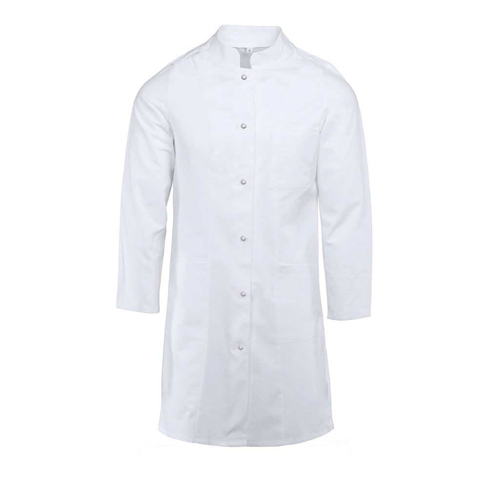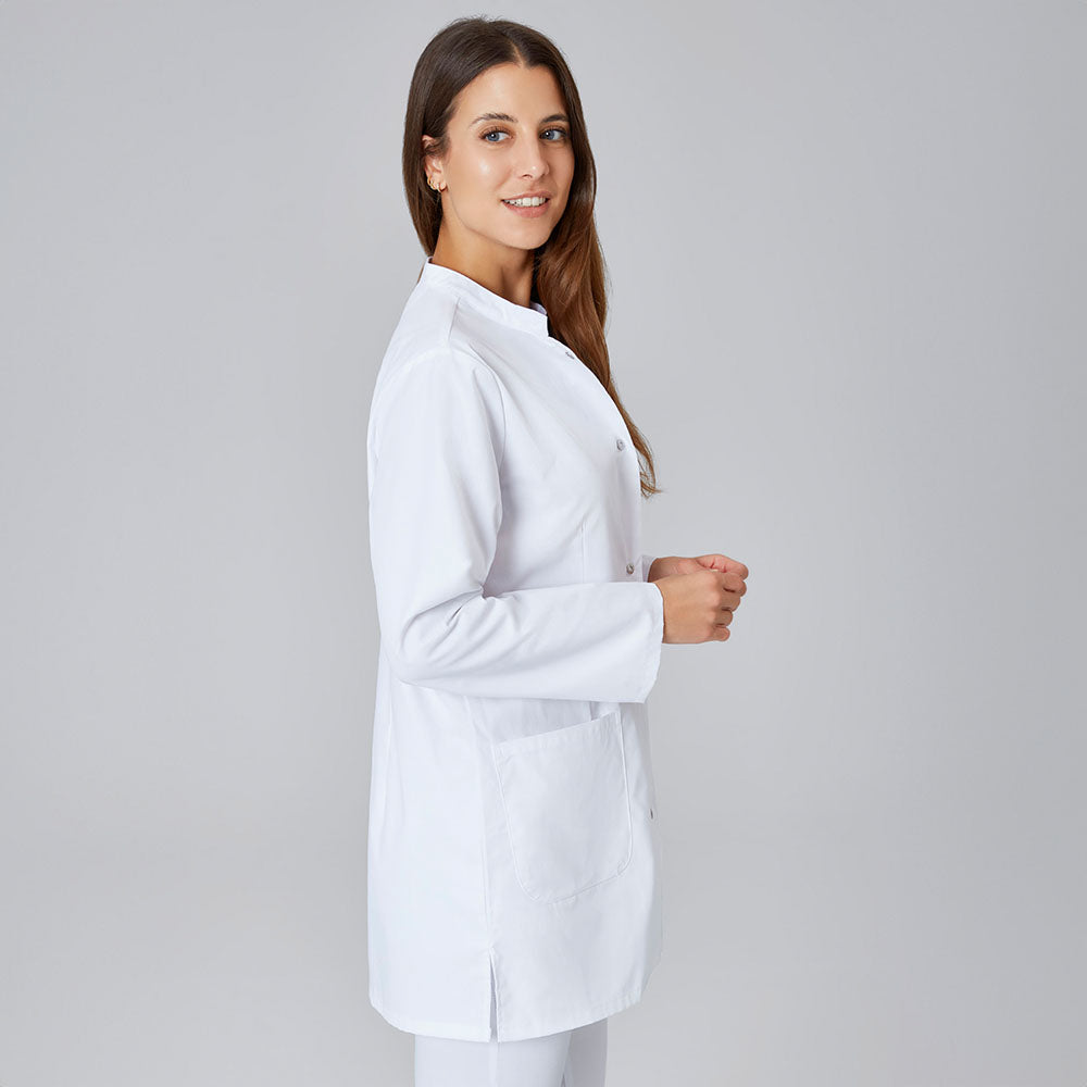 Dieser Damen-Kurzmantel mit Langarm besticht durch zeitlose Eleganz und praktische Funktionalität für den professionellen Einsatz. Der klassische Stehkragen bietet strukturierten Halt und verleiht dem Modell ein gepflegtes Erscheinungsbild. Die kurze Schnittform mit einer Rückenlänge von etwa 80 cm (Größe S) ermöglicht uneingeschränkte Bewegungsfreiheit und schafft eine moderne, schlanke Silhouette. Der seitliche Schlitz (ca. 10 cm) erhöht den Tragekomfort beim Sitzen und Gehen zusätzlich. Die hochwertige Materialmischung aus 50 % Baumwolle und 50 % Polyester (175 g/m²) vereint Hautfreundlichkeit mit Formstabilität und Pflegeleichtigkeit. Die samtweiche Soft-Touch-Oberfläche sorgt für angenehmen Tragekomfort den ganzen Tag über. OEKO-TEX® Standard 100 Zertifizierung garantiert Schadstofffreiheit und optimale Hautverträglichkeit. Die praktische Druckknopfleiste ermöglicht schnelles An- und Ausziehen. Eine großzügige Brusttasche (ca. 12 x 13 cm) bietet Stauraum für Stifte, Handy und weitere kleine Arbeitsmittel.