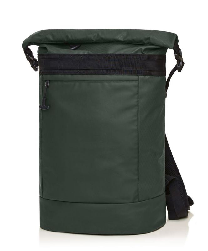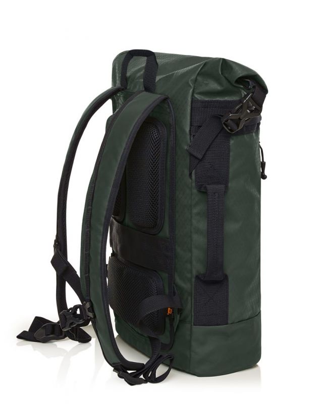Aufwändig gearbeiteter Rolltop-Rucksack; Reißverschluss-Hauptfach mit seitlichen Steckverschlüssen; gepolstertes Einsteckfach innen; große Reißverschluss-Vortasche; Funktions-Schlaufenband auf der Front; rückseitig Befestigungsschlaufe für Trolley-Gestänge; verstecktes Reißverschluss-Fach; gepolstertes Tragesystem mit höhenverstellbarem Brustgurt; sowohl seitlicher als auch rückseitiger Handgriff