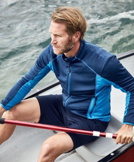 Stehkragen, durchgehend unterlegter Reißverschluss mit Kinnschutz, YKK Reißverschlüsse, 2 Seitentaschen mit Reißverschluss, Einsätze und Flatlock-Nähte in Kontrastfarbe, innen angeraut, Außenseite glatt in dezentem Streifen-Design, 30° waschbar, Schonwäsche, nicht bügeln, nicht trocknergeeignet