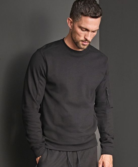 Rundhalsausschnitt, Ärmeltasche mit Reißverschluss, Bündchen aus gleichem Material, weiches und langlebiges Material, 40° waschbar, nicht trocknergeeignet